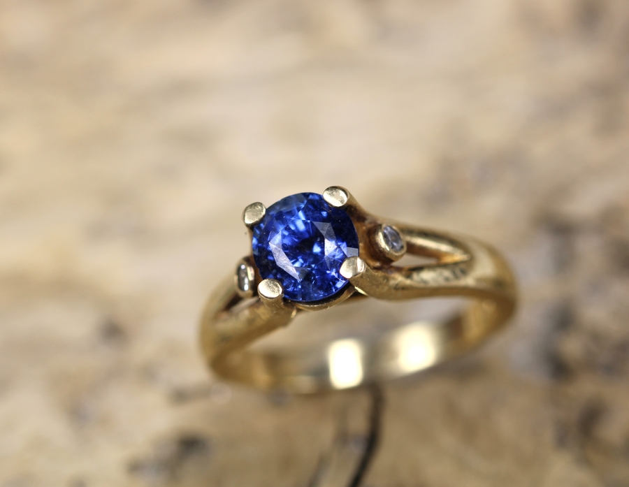 6.8mm 1.74ct round blue sapphire from Sri Lanka set in 14ky ring with 2-2mm round diamonds