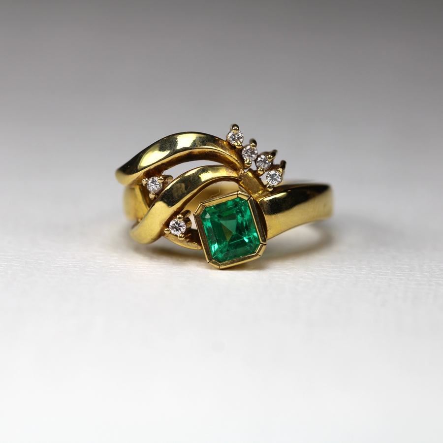 5.38x5.44mm 0.70ct square cut Emerald from Columbia set in 18ky bezel with 6 round diamond accents.