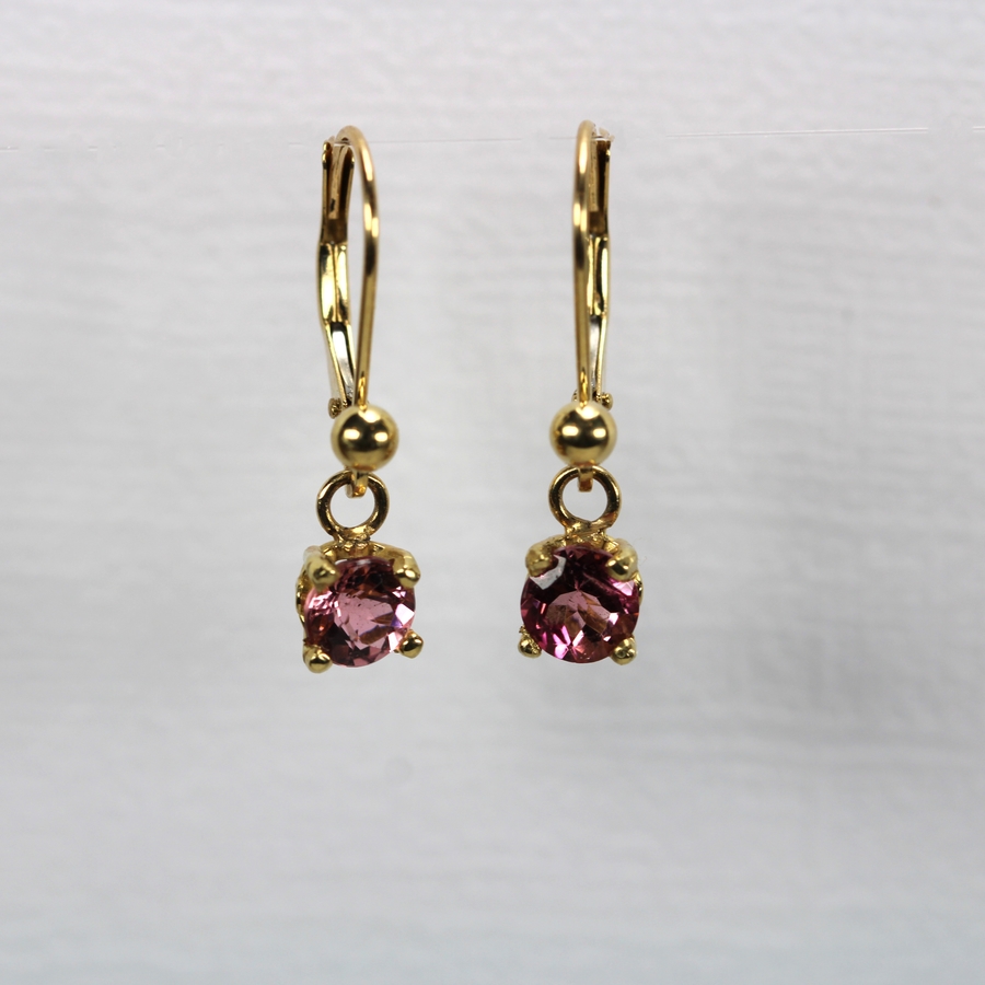 2- 6mm round 1.76 cttw pink Tourmaline from Newry Maine set in 14 ky leverback earrings.