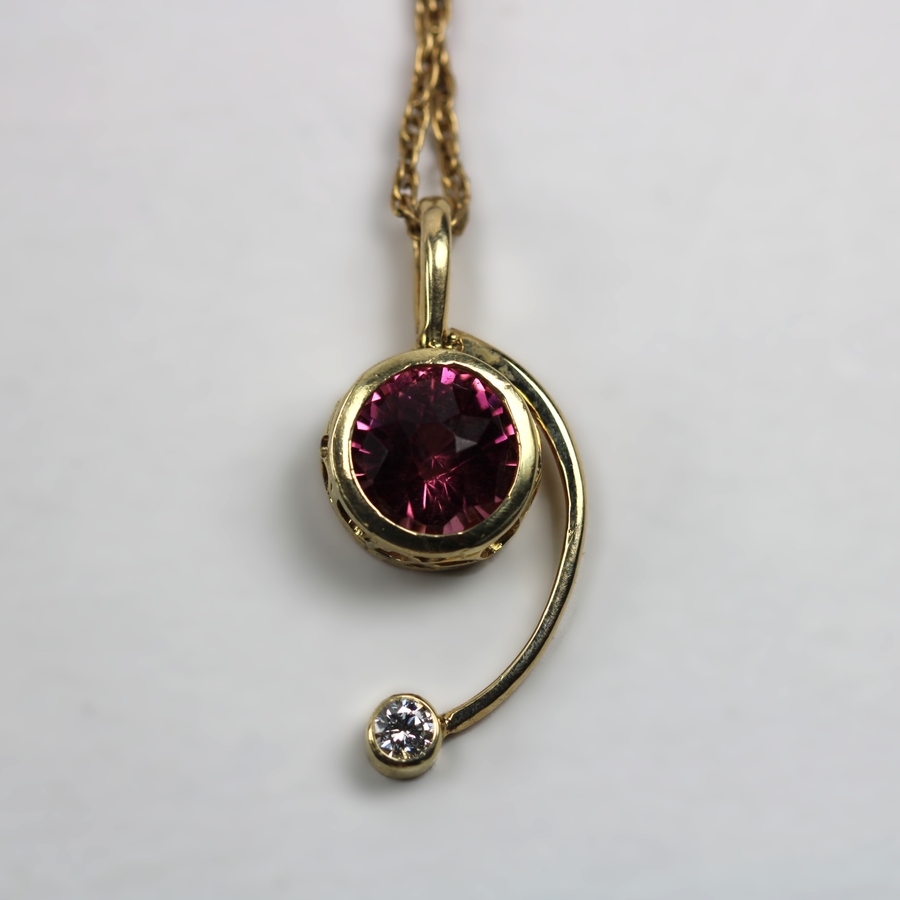 8mm 2.32ct round pink Tourmaline from Newry Maine with a 3mm round diamond set in 14ky handmade bezel setting.